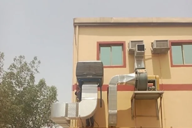 In a typical commercial food service facility cooling the fresh air in the kitchen hood is crucial. Chefs often switch off the kitchen hood fresh air fan to avoid the discomfort and health risks associated with uncontrolled hot fresh air. However, this creates a negative pressure that leads to oppressive climatic conditions inside most kitchens during the peak summer in the UAE even after using AC systems for comfort.